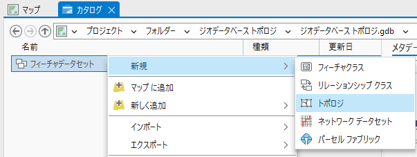 - フィーチャ データセットを右クリックし、[新規] から [トポロジ] をクリックし、ウィザードにしたがって操作を行います。