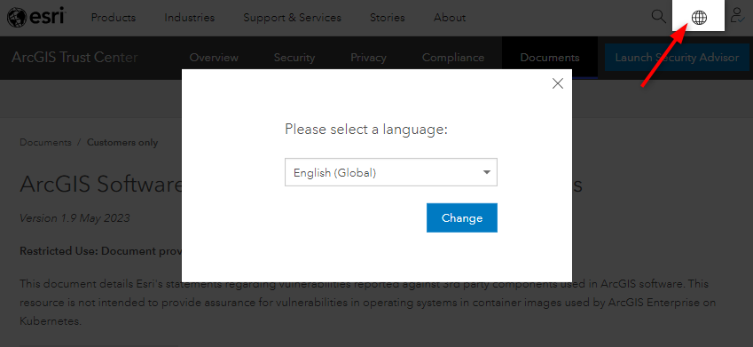 ページ右上の地球儀のマークで言語の設定が可能です。日本語の場合は情報が表示されないため、英語のロケールに変更してご参照ください。Esri ジャパンサポートサイトでのお知らせ