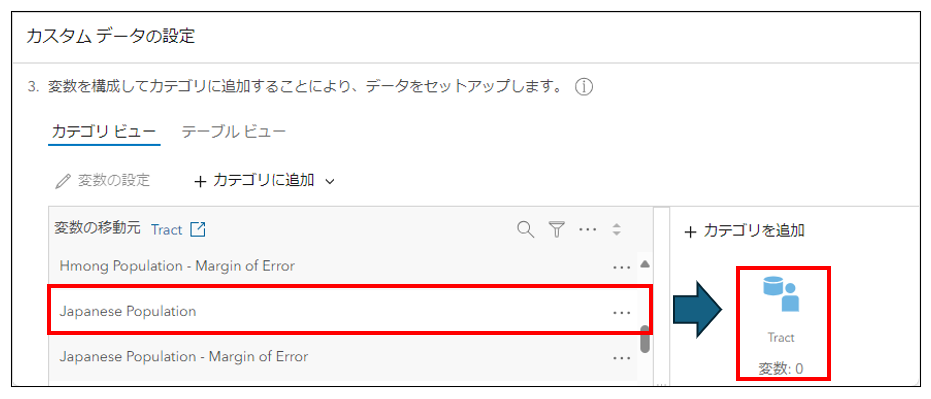 - カテゴリ:「Tract」にカーソルをあて、[開く] → [Tract] を展開し、変数:「Japanese Population」の右側の […] → [変数の構成] をクリックします。