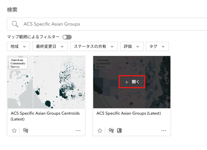 - 検索欄で「ACS Specific Asian Groups」と検索し、「ACS Specific Asian Groups (Latest)」の [+ 開く] をクリックします。