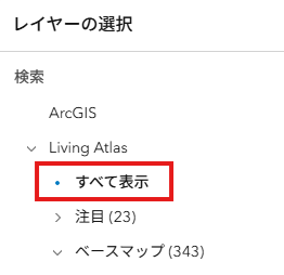 - 画面左部の「検索」タブから [Living Atlas] → [すべて表示] をクリックします。