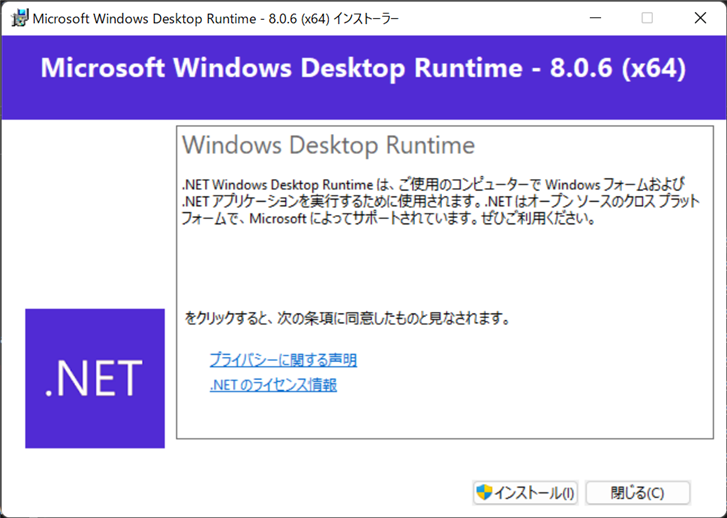 ※「コンソール アプリ」用や「サーバー アプリ」用のランタイムは異なるプログラムです。 - ダウンロードした「windowsdesktop-runtime-8.0.x-win-x64.exe」をダブル クリックします。