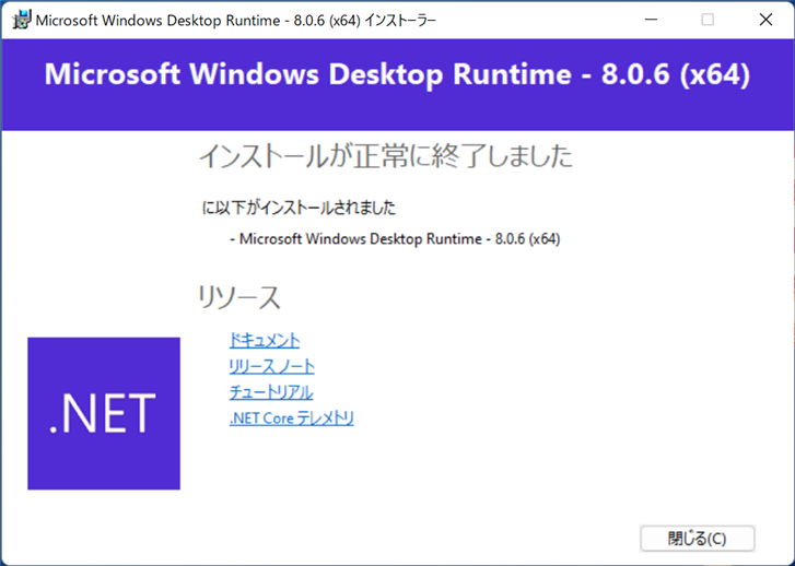 - 完了画面が表示されたら、[閉じる] をクリックして、Microsoft Windows Desktop Runtime 8.0.x (x64) のインストールを完了します。