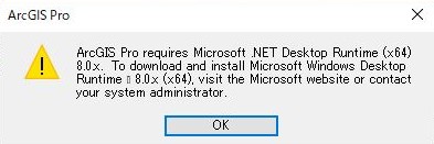 「ArcGIS Pro requires Microsoft .NET Desktop Runtime (x64) 8.0.x. To download and install Microsoft Windows Desktop Runtime 8.0.x (x64), visit the Microsoft website or contact your system administrator.」