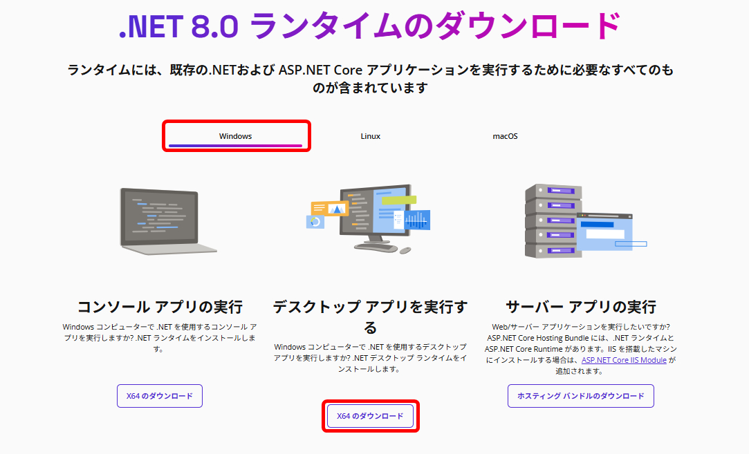 https://dotnet.microsoft.com/ja-jp/download/dotnet/8.0/runtime