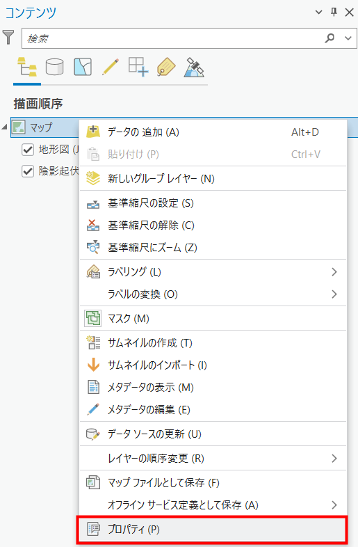[コンテンツ] ウィンドウ → [マップ] を右クリック → [プロパティ] をクリックします。