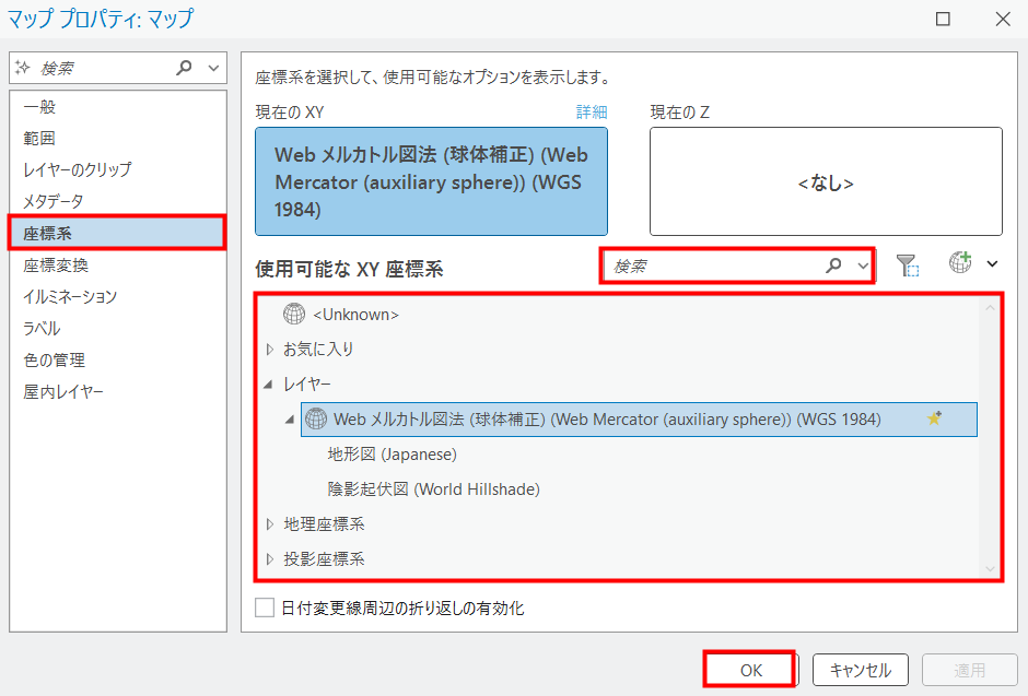- [マップ プロパティ] ダイアログ ボックス → [座標系] タブをクリックし、[検索] バーにて設定したい座標系を入力後、[使用可能な XY 座標系] にて座標系を選択後、[OK] をクリックします。