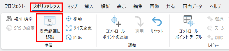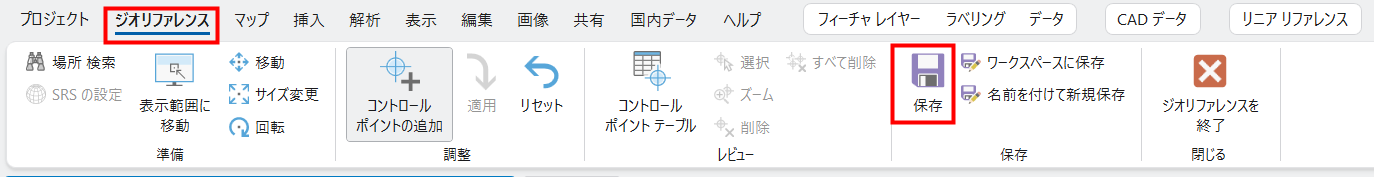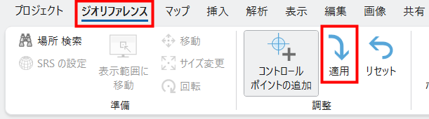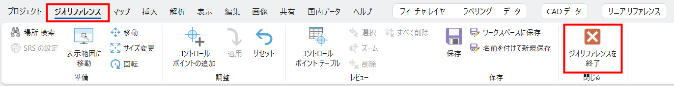 - ジオリファレンスを終了する際は、[ジオリファレンス] タブ → [閉じる] グループ → [ジオリファレンスを終了] をクリックします。