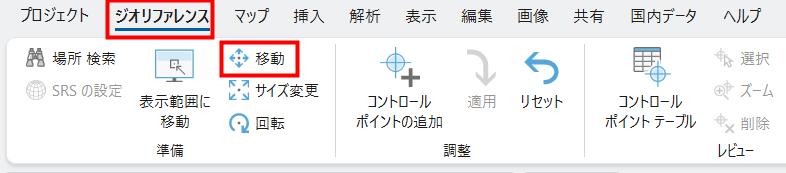 - CAD データの位置を調整するために [ジオリファレンス] タブ → [準備] グループ → [移動] をクリックします。