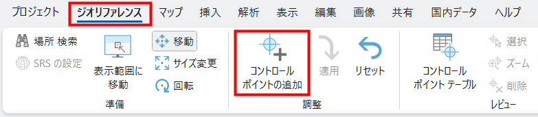 また、コントロール ポイントを作成することでも位置を調整できます。[ジオリファレンス] タブ → [調整] グループ → [コントロール ポイントの追加] をクリックします。