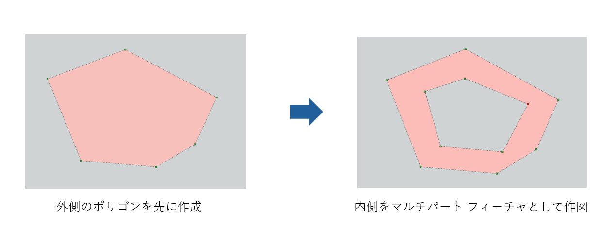 補足情報:ドーナツ ポリゴン (空洞をもつポリゴン) を作成する場合もマルチパート フィーチャとして作成します。パートを削除する方法