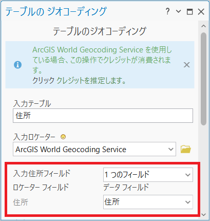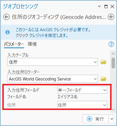 ジオコーディングに使用する住所は 1 つのフィールドに格納し、ジオコーディングを行う際、[入力住所フィールド] パラメーターは「単一フィールド」(1 つのフィールド)を選択します。