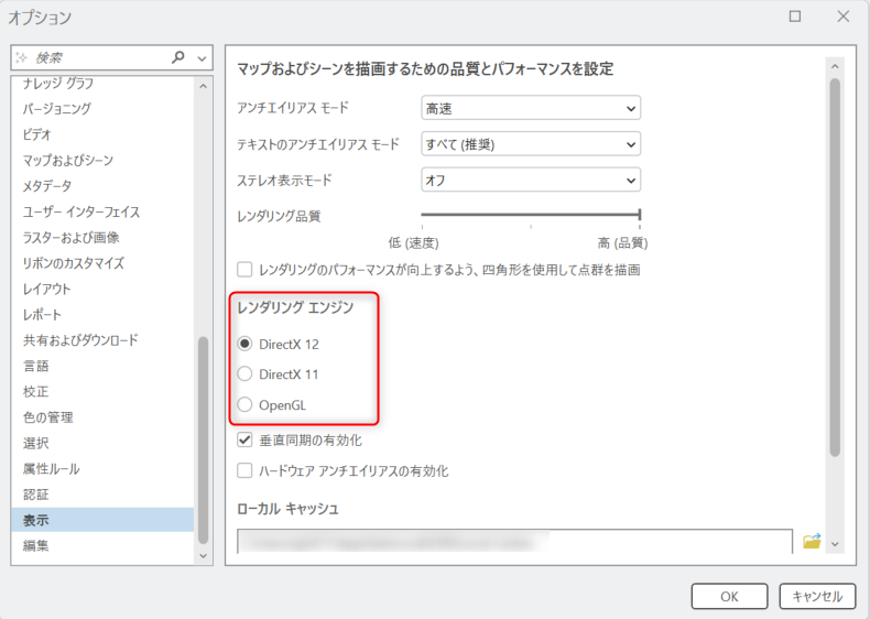 ArcGIS Pro のレンダリング エンジン設定を、現在選択されているものとは別の選択肢へ変更し、パフォーマンスが改善されるか確認してください。
