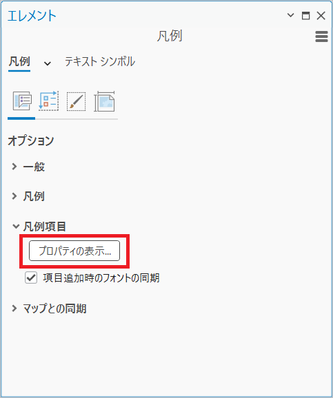 - [オプション] タブの [凡例項目] を展開し、[プロパティの表示] をクリックします。