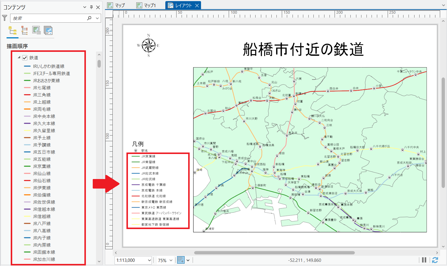 下記のようにマップ内に表示されているフィーチャのシンボルのみ凡例に表示する場合は、以下の設定を行います。
