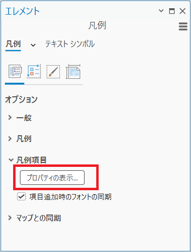 - [オプション] タブの [凡例項目] を展開し、[プロパティの表示] をクリックします。