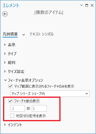 - [フィーチャ表示オプション] の [フィーチャ数の表示] にチェックを入れます。デフォルトでは半角括弧が使用されます。必要に応じて変更します。レイアウト上に表示される個数が 1000 個を超える場合に区切り記号を設定したい場合は、[桁区切り記号を表示] にチェックを入れます。