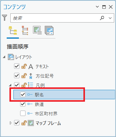 - レイアウト ビューの [コンテンツ] ウィンドウで、個数を表示させたいレイヤーのみを「凡例」グループ内で選択します。複数レイヤーが存在する場合は、Ctrl キーを押しながら選択します。