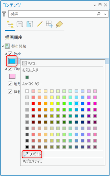 既存のフィーチャの色を別のフィーチャに適用するには、[スポイト] 機能を用いる方法とカラー エディターで調べる方法があり、他のフィーチャに適用し利用することができます。また、スタイルへの色の保存をすることで、同様の色を再使用することができます。 ここでは、この 3 種類の方法を紹介します。