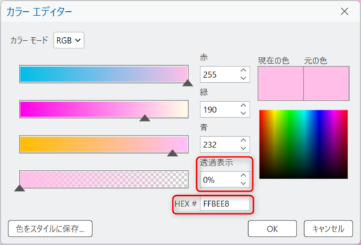 - 表示された [カラー エディター] ダイアログの [HEX #] と [透過表示] を記録しておきます。