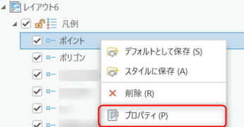 - [コンテンツ] ウインドウの凡例グループ下にある対象のポイント レイヤーのみを選択して右クリック → [プロパティ] をクリックします。