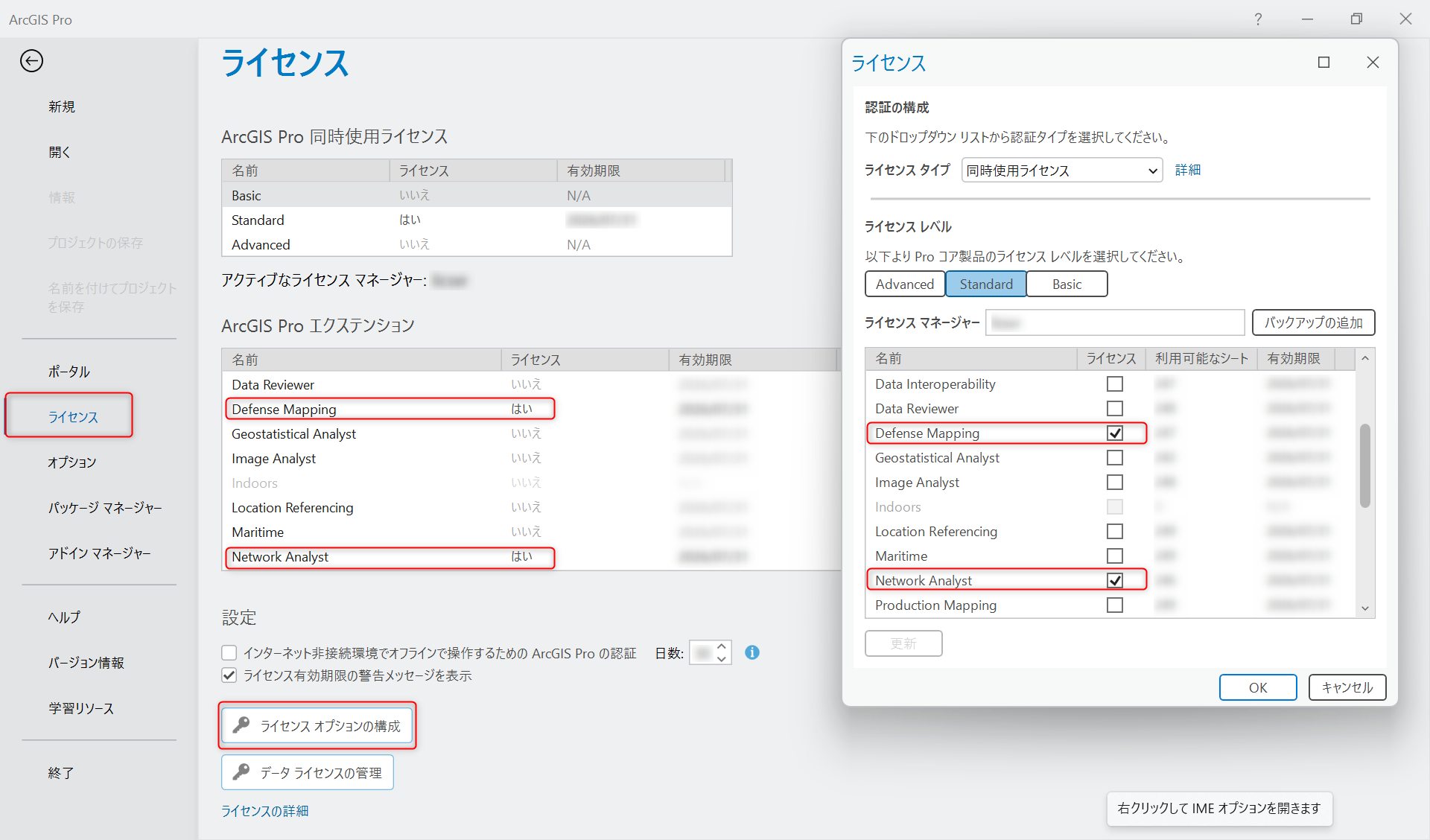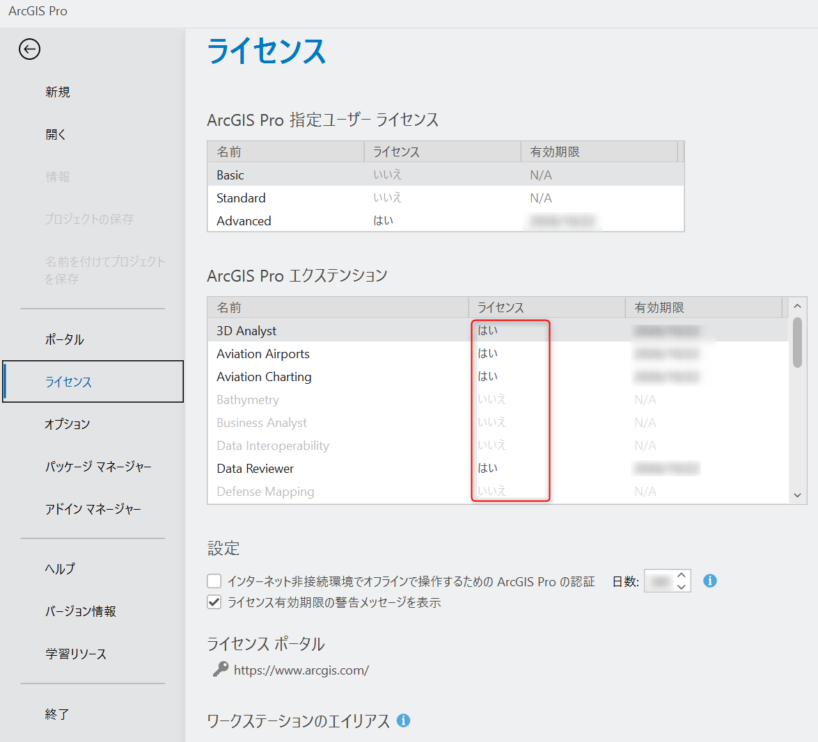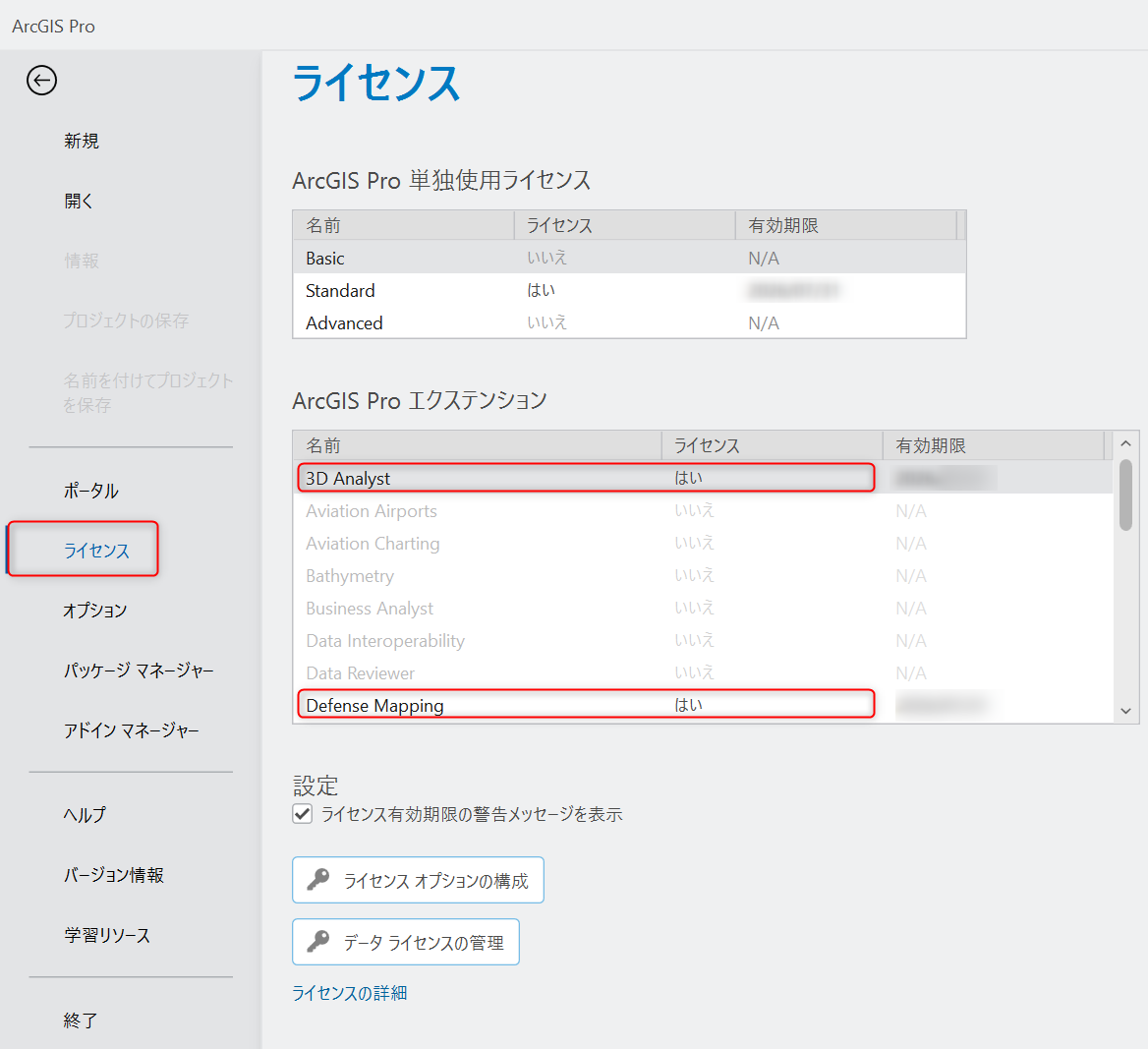 - [設定] → [ライセンス] をクリックします。該当のエクステンションが [ArcGIS Pro エクステンション] の [ライセンス] 列に「はい」と表示されているか確認します。