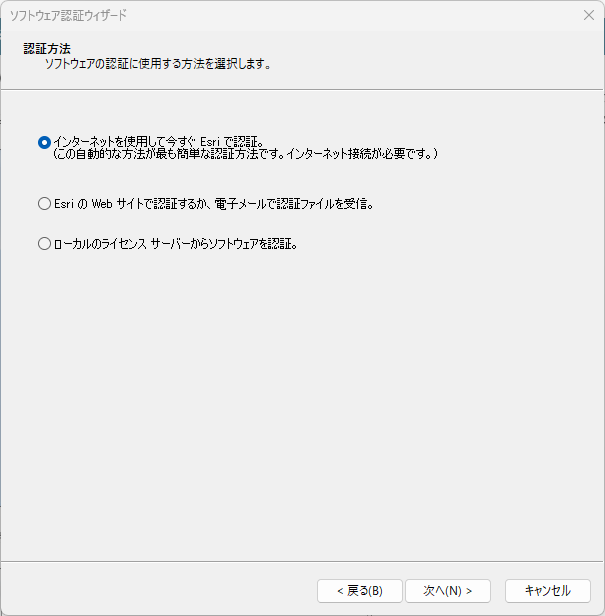 ここでは、最も簡単な認証方法の [インターネットを使用して今すぐ Esri で認証。...] を選択しています。