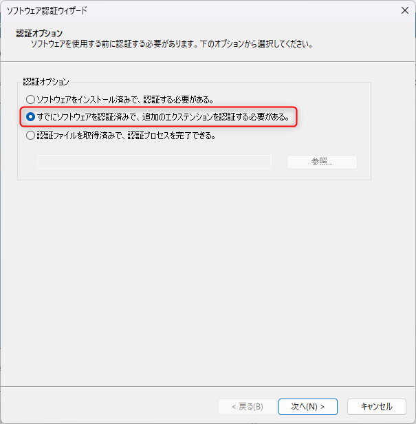 - 以下の画面で、[すでにソフトウェアを認証済みで、追加のエクステンションを認証する必要がある。] を選択し、[次へ] をクリックします。