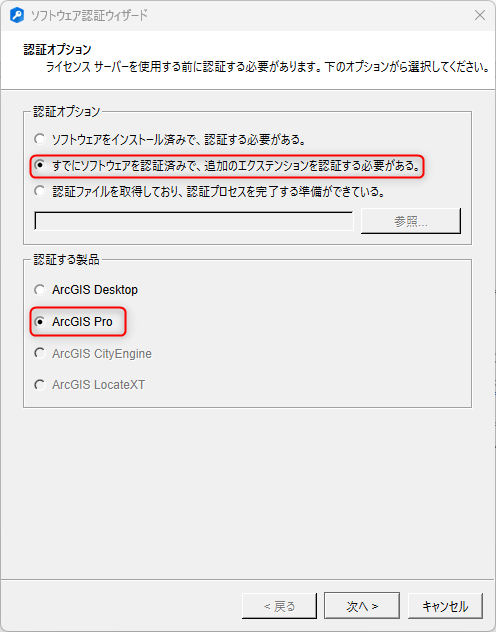- [認証オプション] の項目で [すでにソフトウェアを認証済みで、追加のエクステンションを認証する必要がある。] を選択し、[認証する製品] では [ArcGIS Pro] を選択します。[次へ] をクリックします。