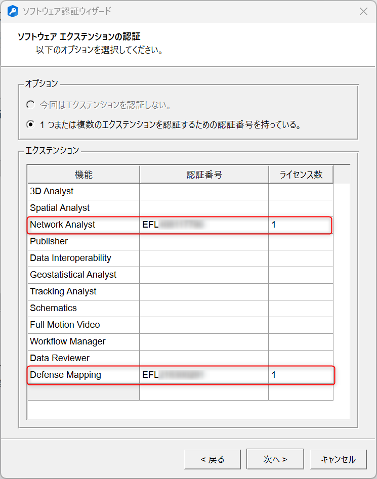 * は必須フィールドです。 - [ソフトウェア エクステンションの認証] にて、所有しているエクステンションの認証番号(「EFL+ 数字 9 桁」)を手動で入力します。認証するライセンス数を入力し、[次へ] をクリックします。