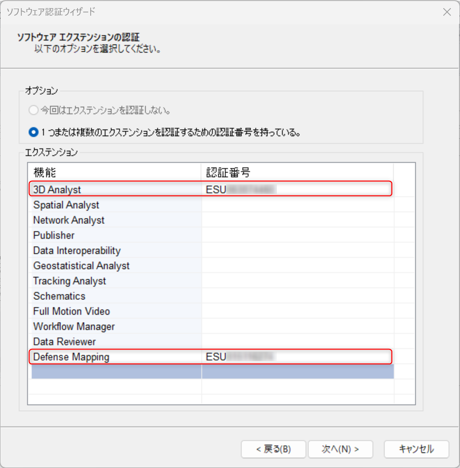 [機能] 欄に記載のないエクステンションの場合は、[機能] の空白欄に手動でエクステンション名を入力してください。 - ウィザードに従って進め、ライセンス認証を完了します。