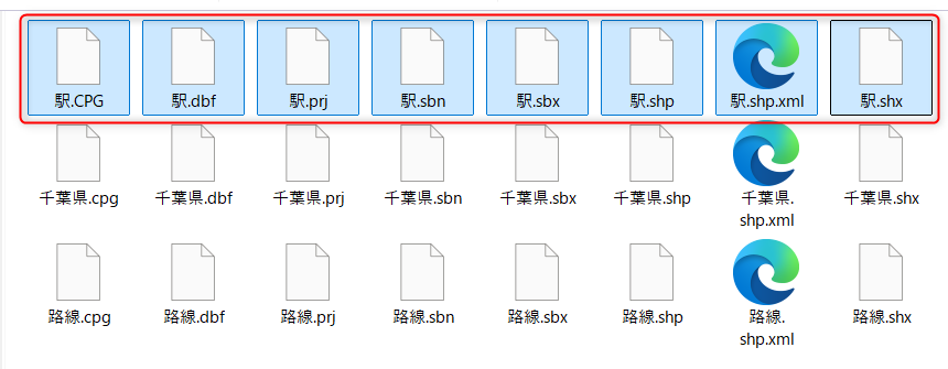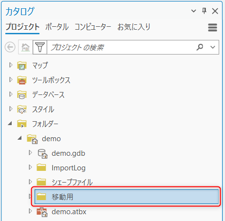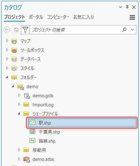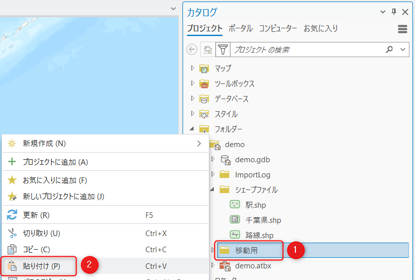 以下の例では、「駅」という名称のシェープファイルを「移動用」というフォルダーに貼り付けてから移動を行っています。