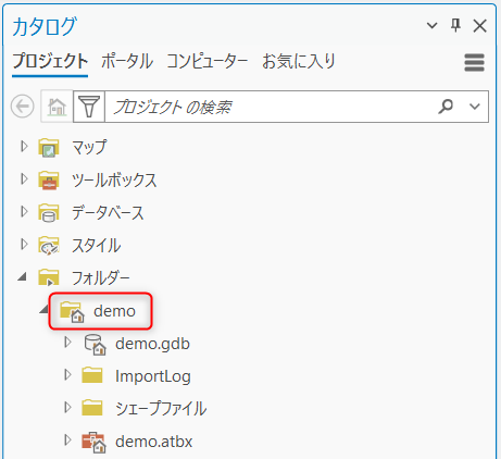 Windows エクスプローラーで確認した場合、1 つのシェープファイルは異なる拡張子を持つ複数のファイルとして表示されます。ArcGIS Pro の [カタログ] ウィンドウで確認すると、以下のように 1 つのデータとして確認できます。