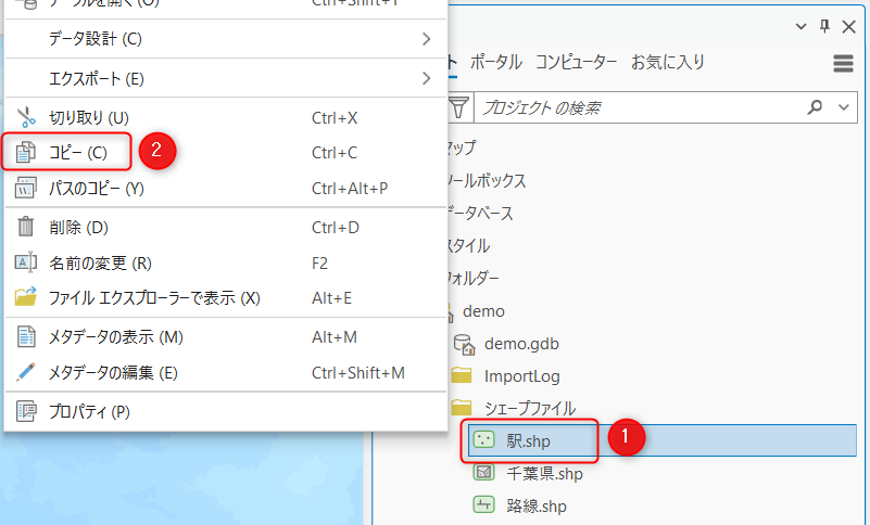 - 移動させたいシェープファイルを右クリックし、[コピー] をクリックします。