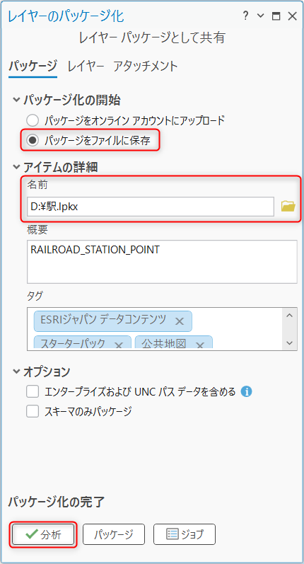 [レイヤーのパッケージ化] ウィンドウが開きます。 - [パッケージをファイルに保存] を選択し、保存場所と名前を指定します。