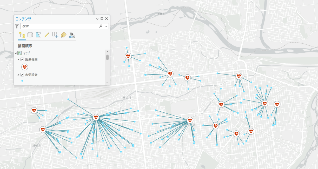 ArcGIS Pro: ポイントから別のレイヤーの最寄のポイントを見つけ、その直線距離を結ぶ複数のラインを作成するには? (スパイダーグラフ)(バージョン 3.x ~)