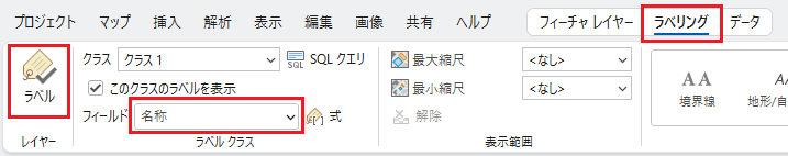 1. [コンテンツ] ウィンドウにてラベリングしたいレイヤーを選択 → ArcGIS Pro 上部の [ラベリング] タブをクリックします。 [フィールド] でラベルを表示させたいフィールドを選択し、[ラベル] をクリックしてレイヤーのラベリングを有効にします。