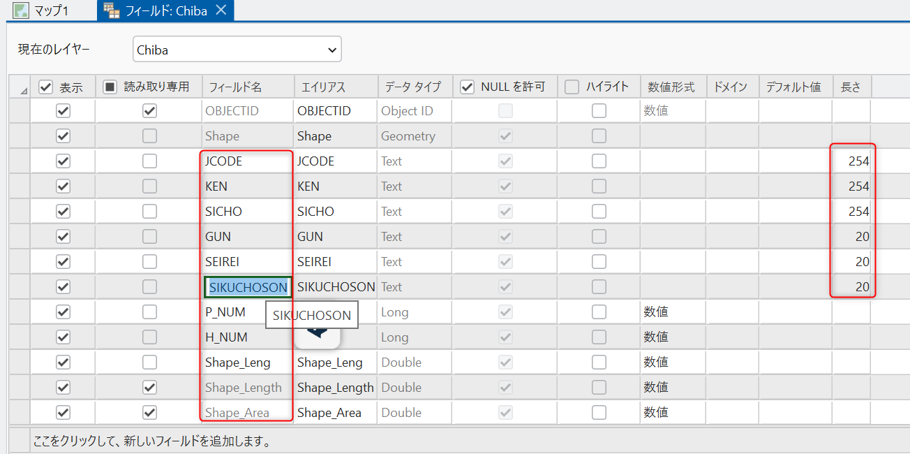 属性テーブルのフィールド ビューからは、フィールド名、フィールド長が変更可能です。レコード(データ)が格納されていない場合は、フィールド タイプ(データ タイプ)も変更可能です。