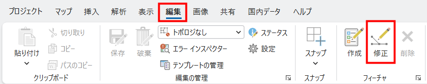 - [編集] タブ → [修正] をクリックし、[フィーチャの修正] ウィンドウを開きます。