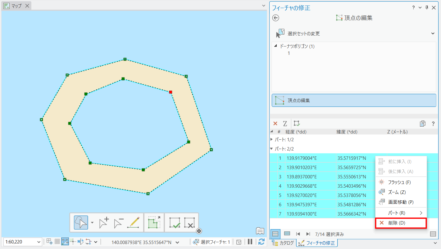 - 選択するとドーナツ ポリゴンの頂点が表示されるほか、[フィーチャの修正] ウィンドウの下側に各頂点のジオメトリ値が表示されます。これらの頂点の内、内側の頂点を複数選択し、右クリック → [削除] をクリックします。