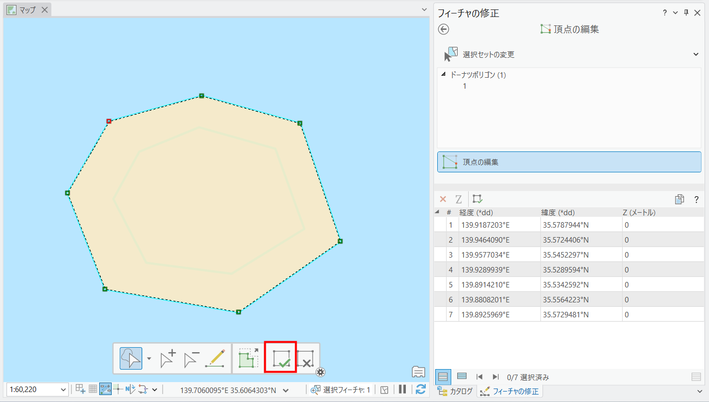 - ドーナツ ポリゴンの内側の頂点を削除したら、マップ下部の [完了] をクリック、もしくは F2 キーをクリックします。