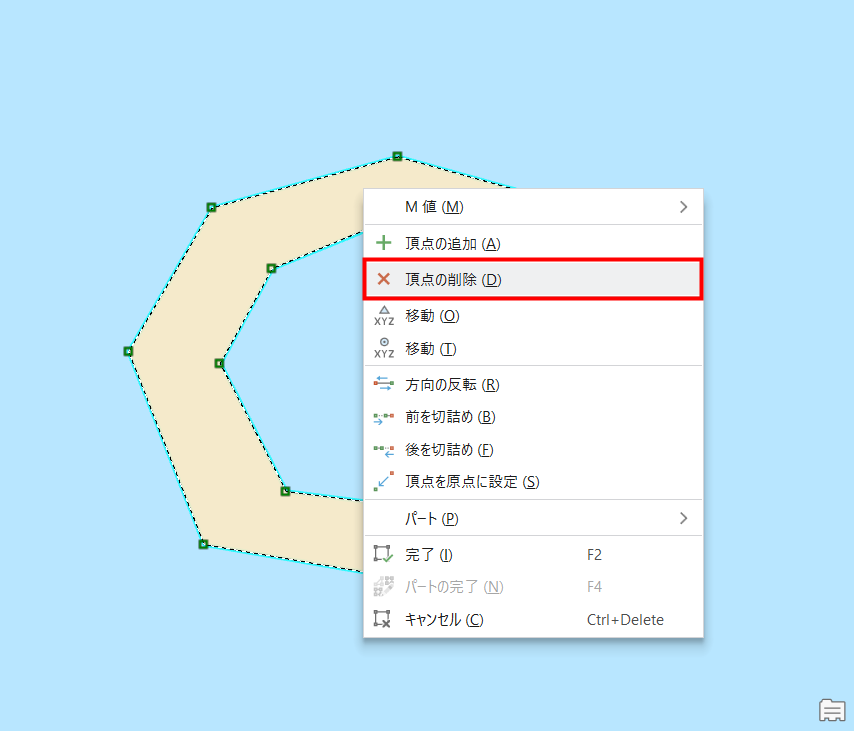 ※ドーナツ ポリゴンの内側の頂点上にカーソルを移動し、カーソル形状が変わった状態で右クリック → [頂点の削除] をクリックして頂点を削除することでも穴埋めができます。