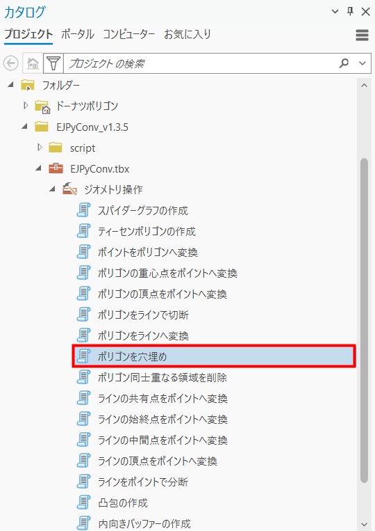 EJPyConv_setup_wiki-ArcGIS Pro への設定方法- EJPyConv ツールのフォルダーを追加した状態で、[カタログ] ウィンドウ → [フォルダー] → [EJPyConv_v●●●] → [EJPyConv.tbx] → [ジオメトリ操作] → [ポリゴンを穴埋め] をクリックします。