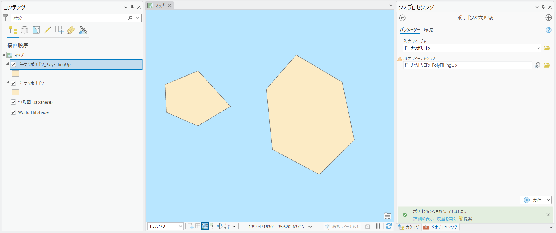 ツールが完了すると、穴が埋まったポリゴンが新しいフィーチャクラスとして作成され、マップに追加されます。