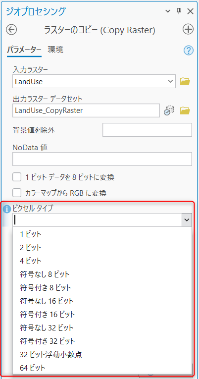 ラスター データのピクセル深度を変更するには、以下の方法があります。- [ラスターのコピー] ツールを利用する方法
