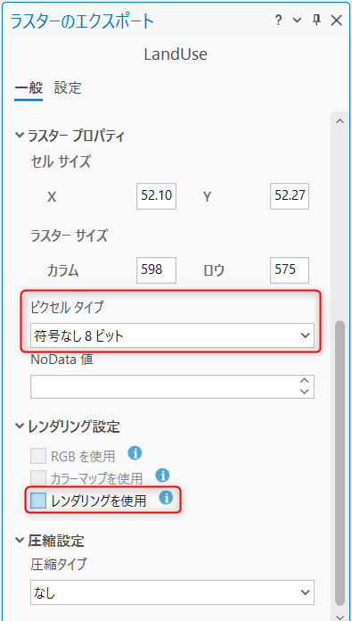 - [ラスターのエクスポート] ウィンドウで任意のピクセル タイプを指定し、[エクスポート] をクリックします。