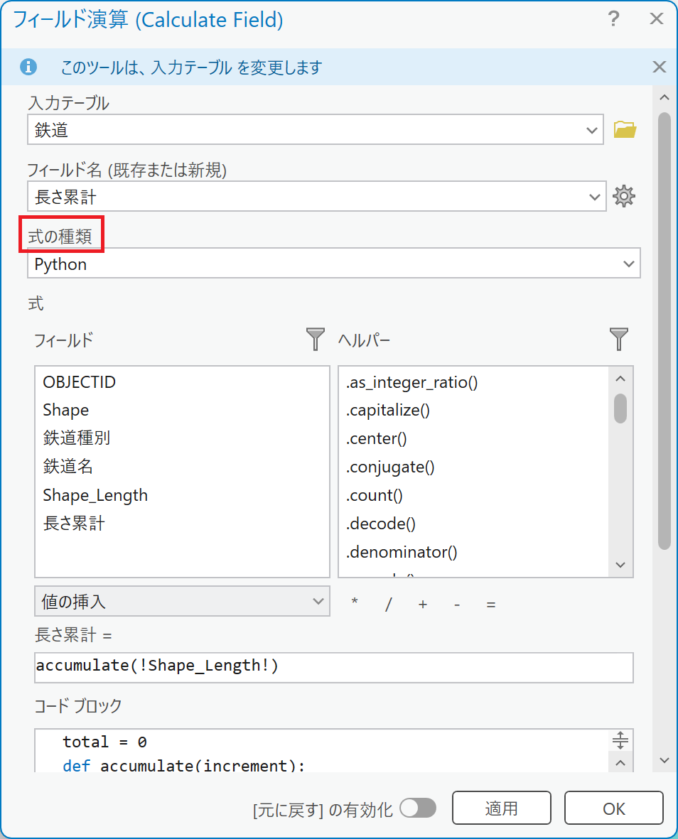 - 保存した .cal ファイルには、フィールド演算の [式の種類] (Python、Arcade 、VBScript、SQL) の情報は含まれません。必要であれば、この情報を別途メモするか条件式のファイル名に含めるなどの方法で保存します。