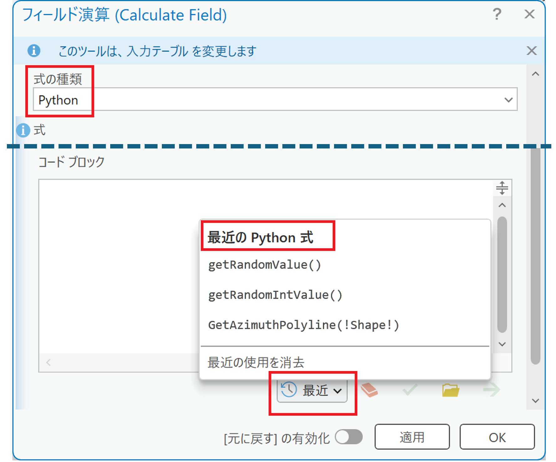 ArcGIS Pro 3.5 以降では、[最近] という機能が追加され、式の種類ごとに最近使用した式を表示できるようになりました。別のプロジェクトを開いている場合でも、ここから以前使用した式を利用することが可能です。